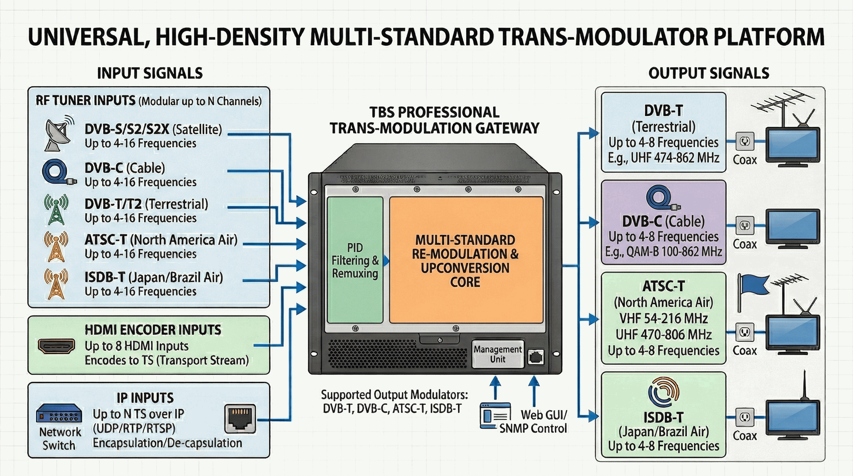 - Ultimate Flexibility (Multi-Standard Support): Break the barriers between broadcast standards. Support for DVB-S/S2/S2X, DVB-C, and DVB-T/T2, ATSC, ISDB-T, HDMI or IP inputs, with flexible modulation to DVB-T, DVB-C, ATSC, or ISDB-T outputs.