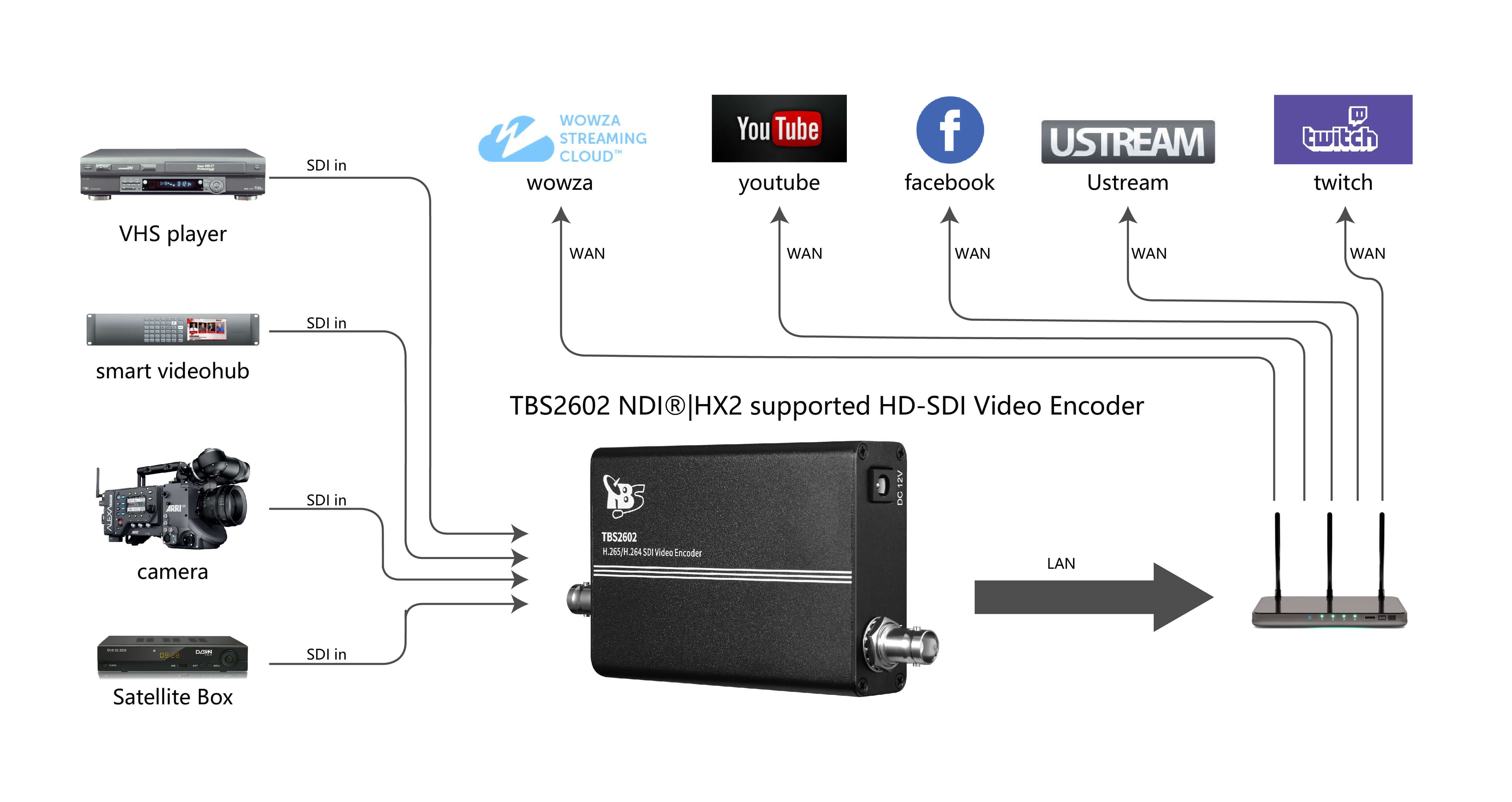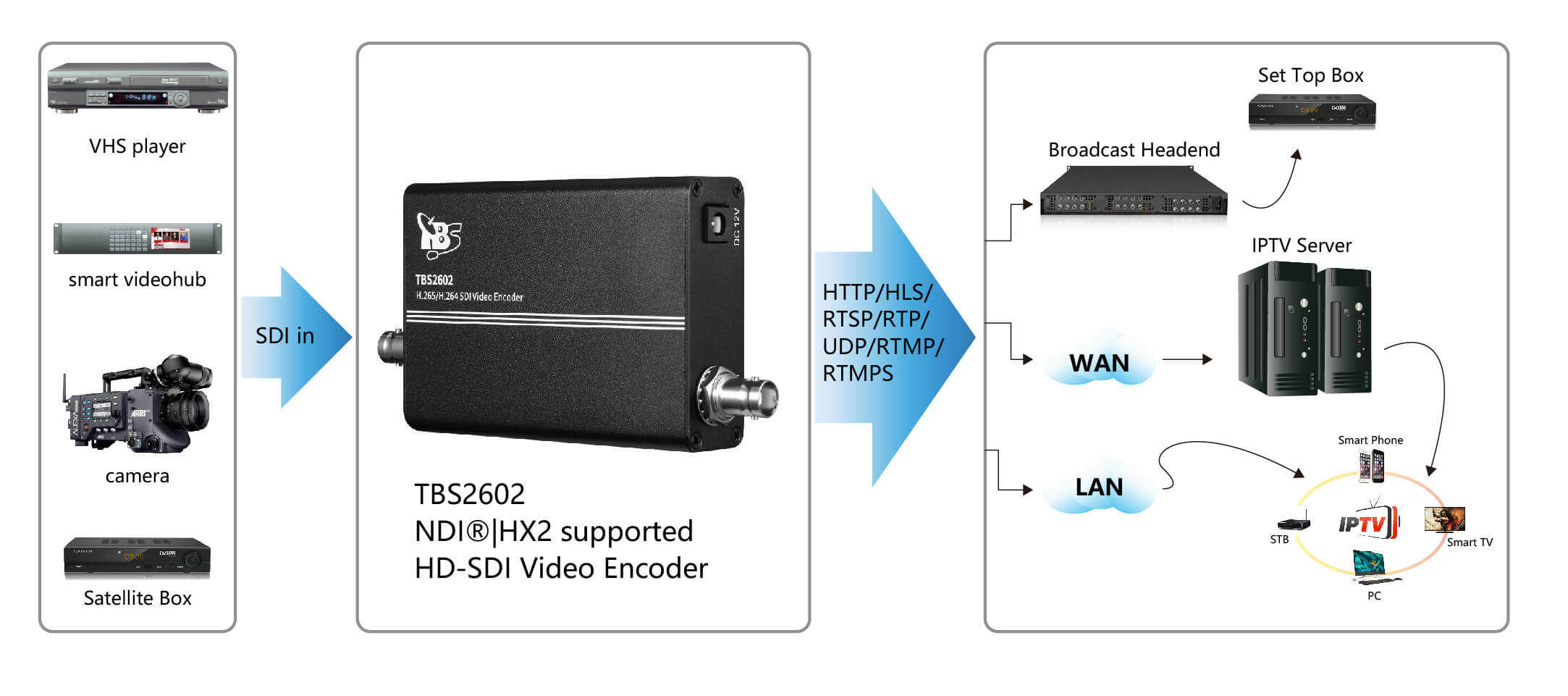 TBS2602 H.265/H.264 SDI Video Encoder has been integrated native NDI®|HX2 support, which allows to send your SDI video source through your local network, over Ethernet for use with other NDI®|HX2 compatible systems. It helps to connect your video cameras and other devices to your live production system, video applications or streaming devices.
