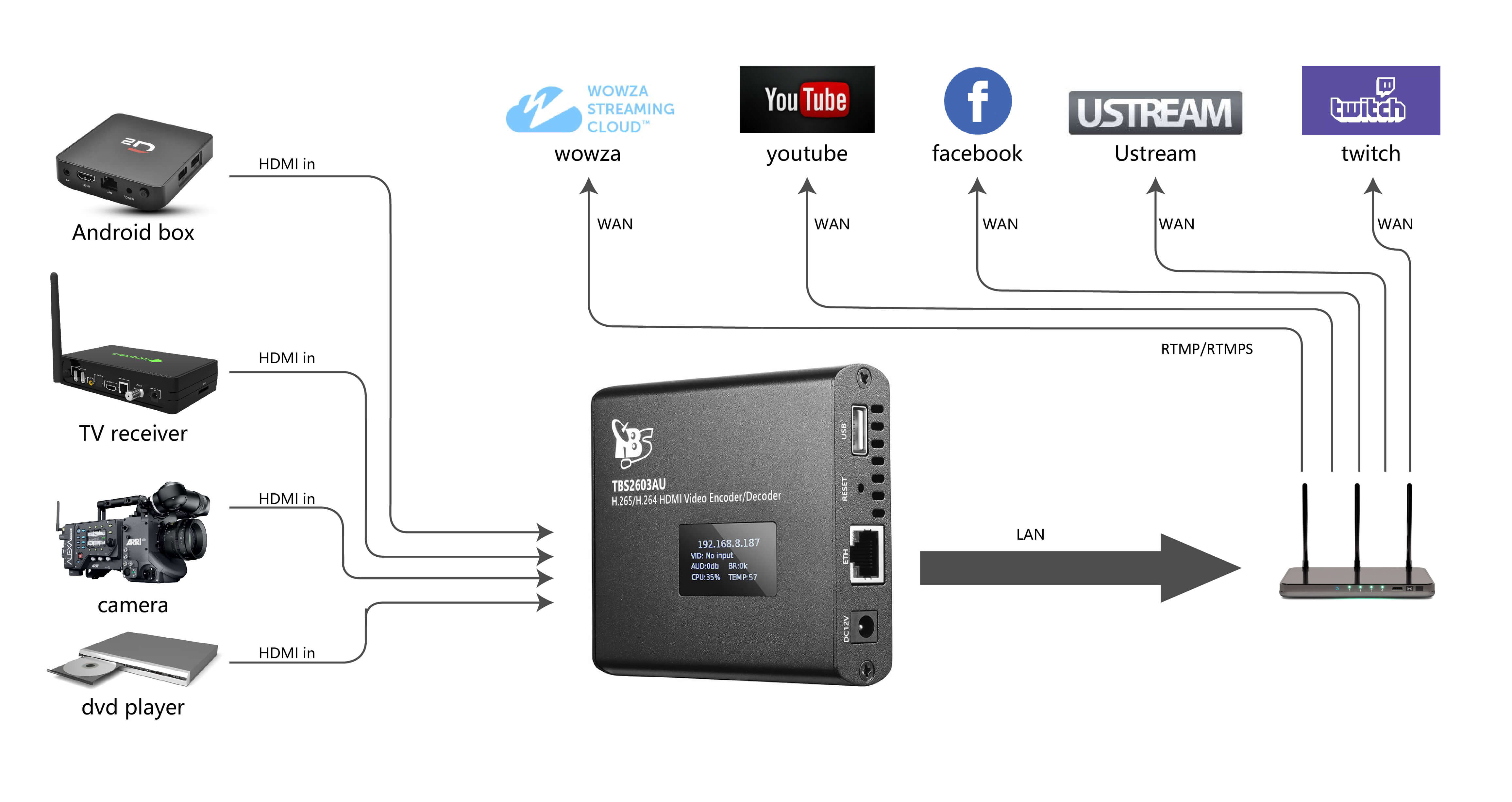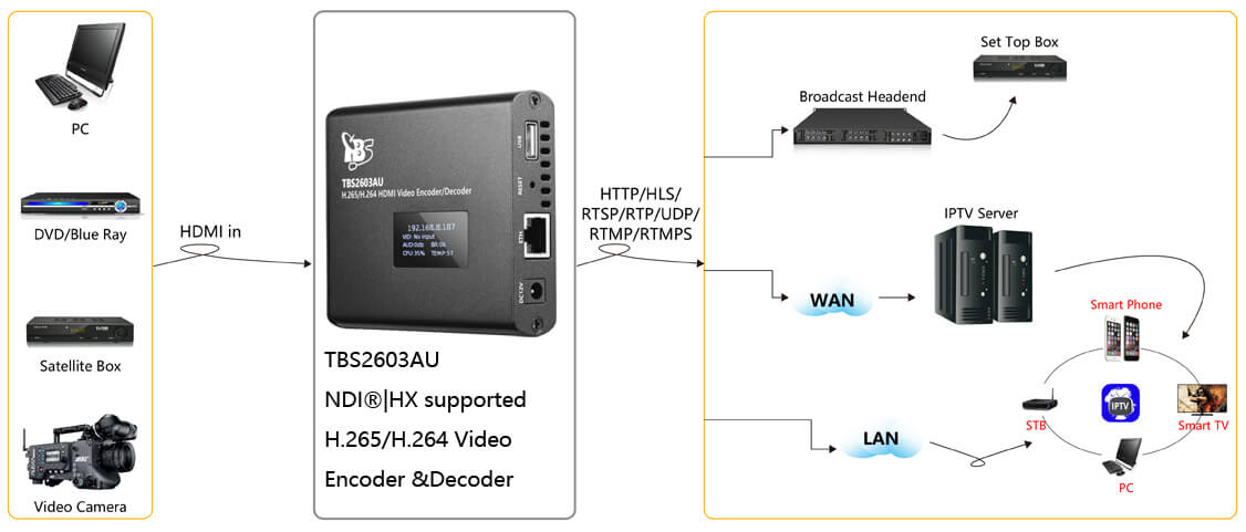 TBS2603au is a NDI®|HX2 supported H.264/H.265 HDMI video Encoder, a professional HD video Encoder/ Decoder, and a HDMI/USB video recorder.