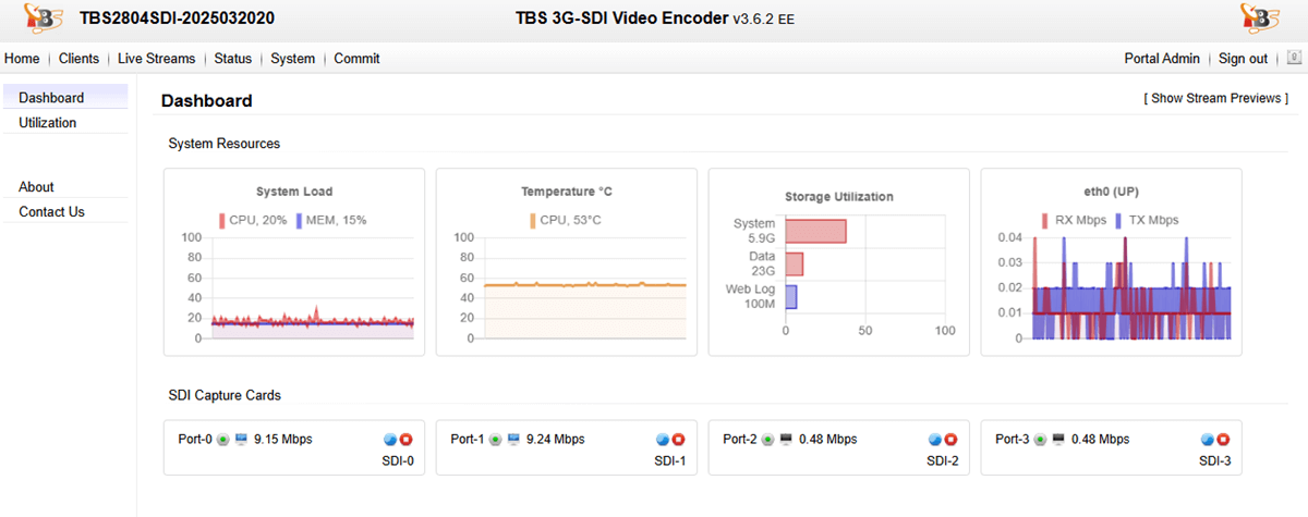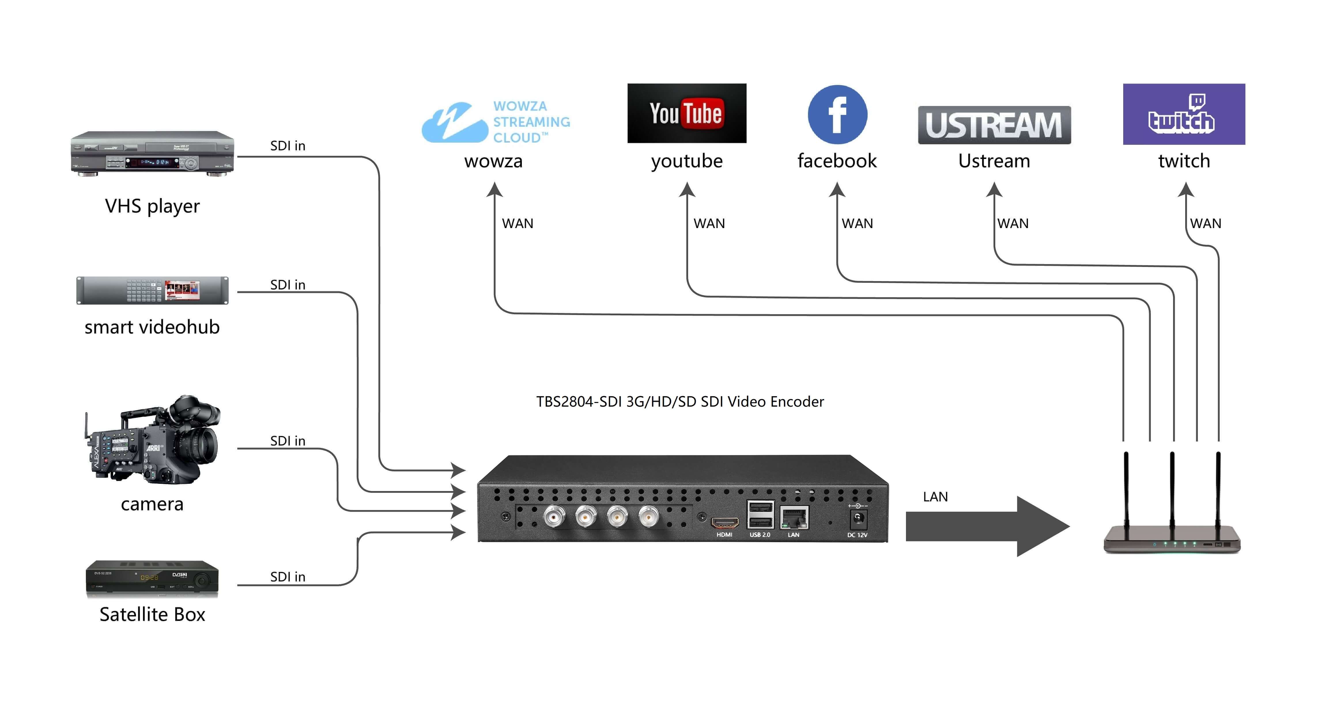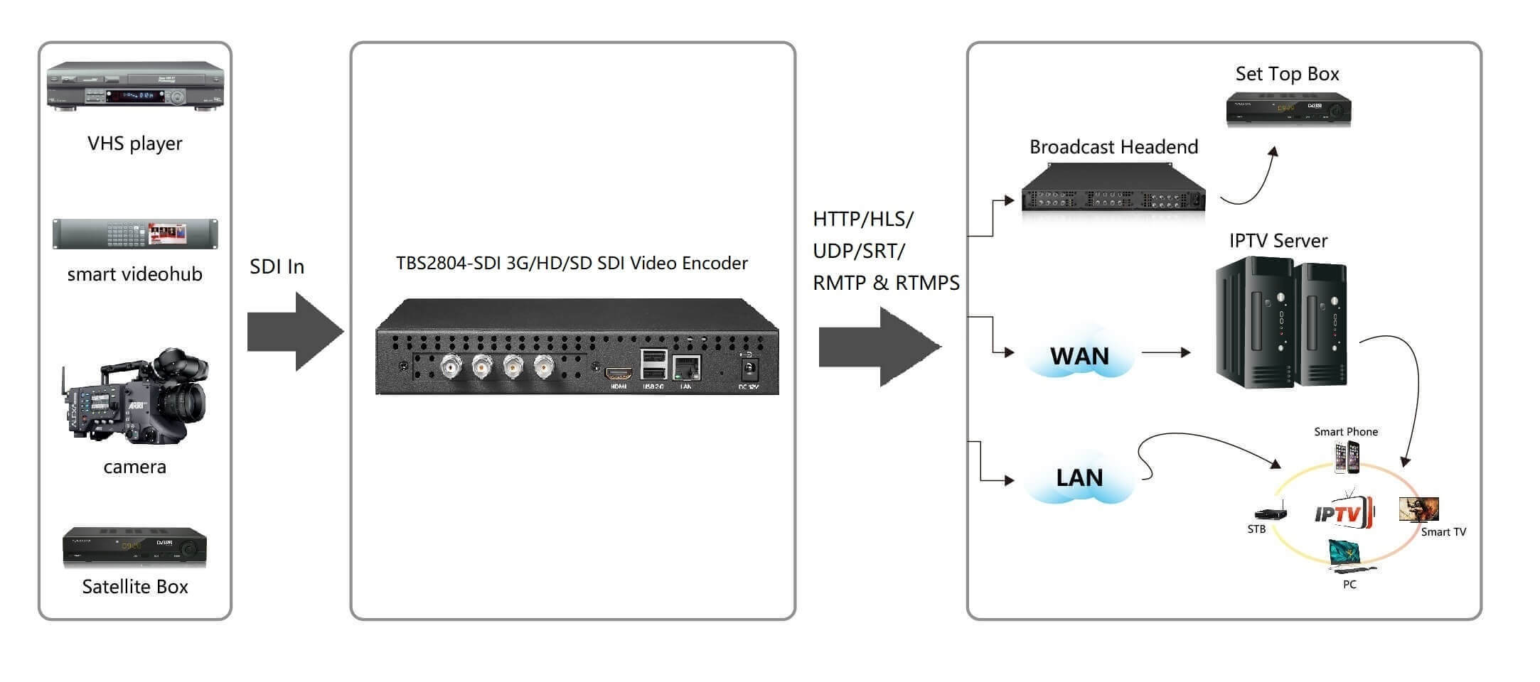 From any SDI video sources and SDI embedded audio,TBS2804SDI can generate H.264/H.265 & AAC-LC/ AAC-HE/ MP2 encoded streams compliant with HLS (m3u8), HTTP, SRT, UDP, RTMP/RTMPS protocols. It provides professional-grade hardware encoding solution for broadcast and streaming applications and more.