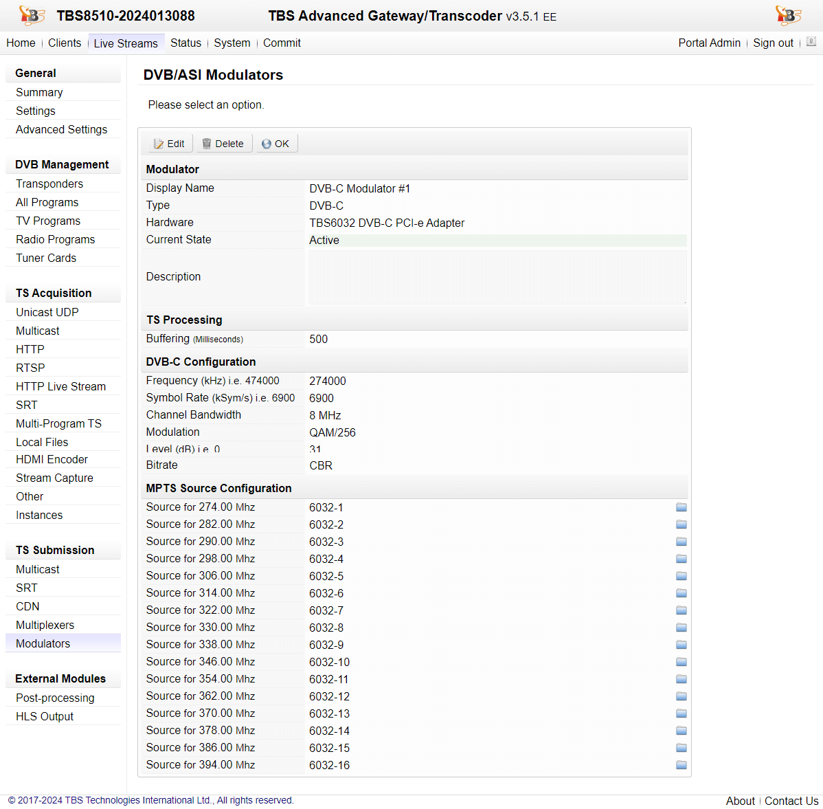 Navigate to "Live Streams" =>"Modulators" page and setup TBS6032 modulator parameters.
