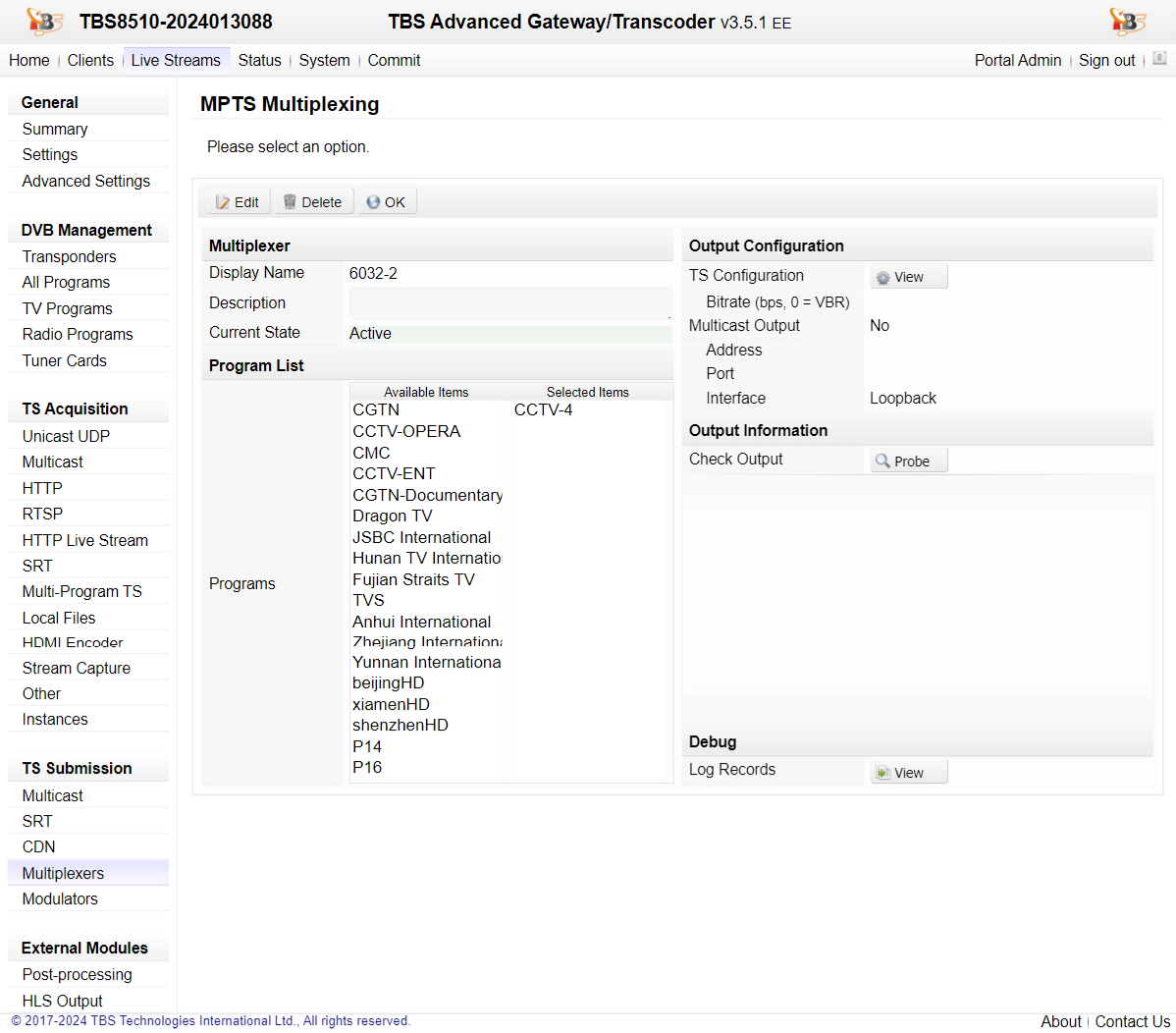 Navigate to "Live Streams" => TS Submission "Multiplexers" page. Click "Multiplexers" and "New Record" to create a new MPTS stream and then configure remux DVB-C outputs.
