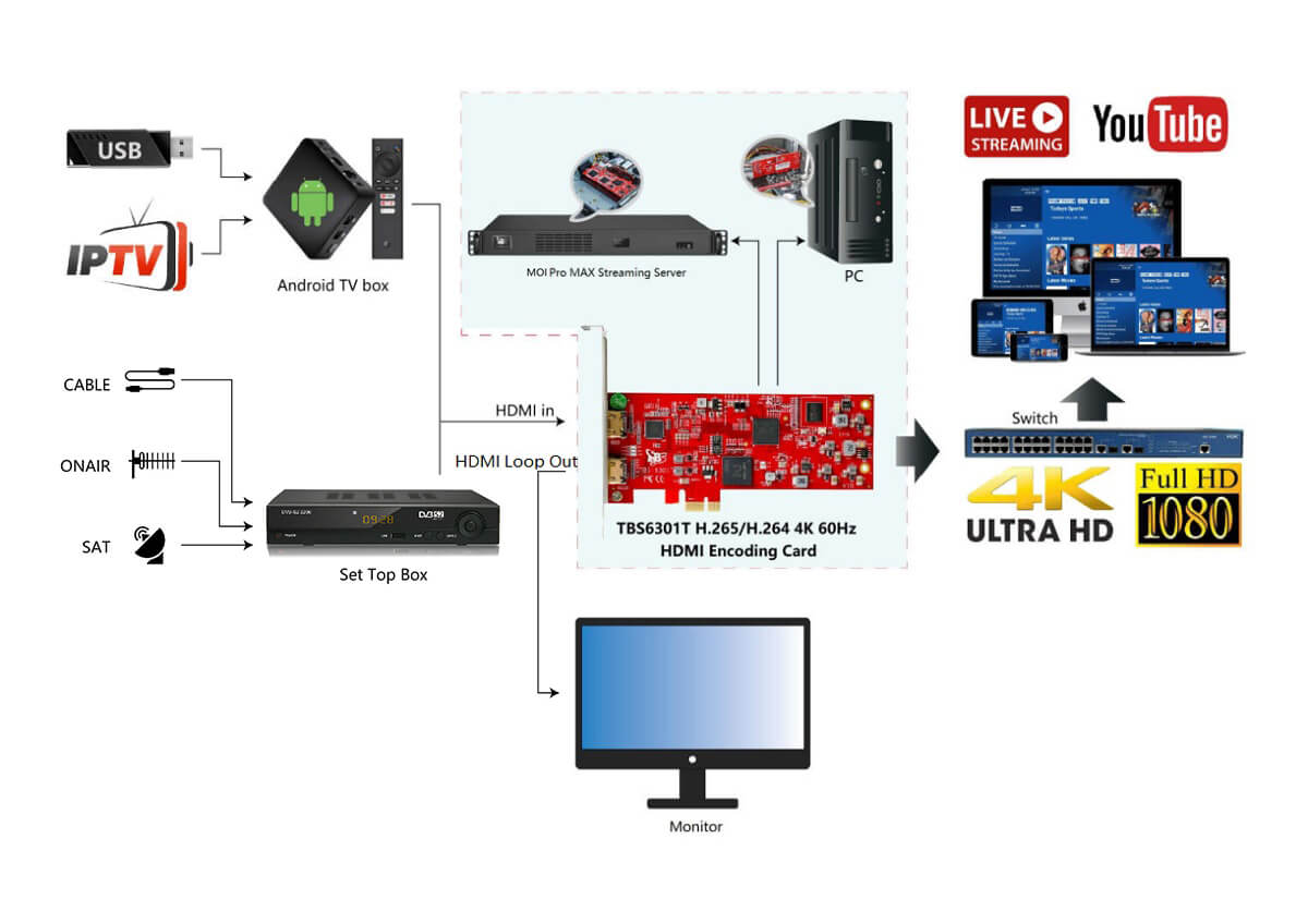 TBS6301T is a HDMI 4K UHD Video Encoding Card, being capable of max 3840 x 2160P@60fps input and H.265 & H.264 encoding. It is an ideal device for whom need to stream lower bit rate video over LAN or WAN networks – often due to internal network limitations, whilst maintaining high quality video.