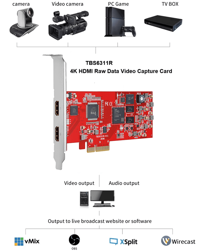- Depending on the computer's configuration, multiple TBS6311R 4K HDMI raw data capture cards can be used in a single PC to capture and broadcast more scenes simultaneously.