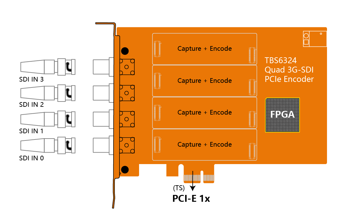 After capturing 3G/HD/SD video from SDI ports, TBS6324 will generate H.264/H.265-encoded stream in TS packet and output via PCIe interface. TBS6324 is based on DVB architecture,so it is compatible with various DVB software such as Kylone,TVheadend, Astra Cesbo, DVB Dream, DVBViewer, TSReader etc.