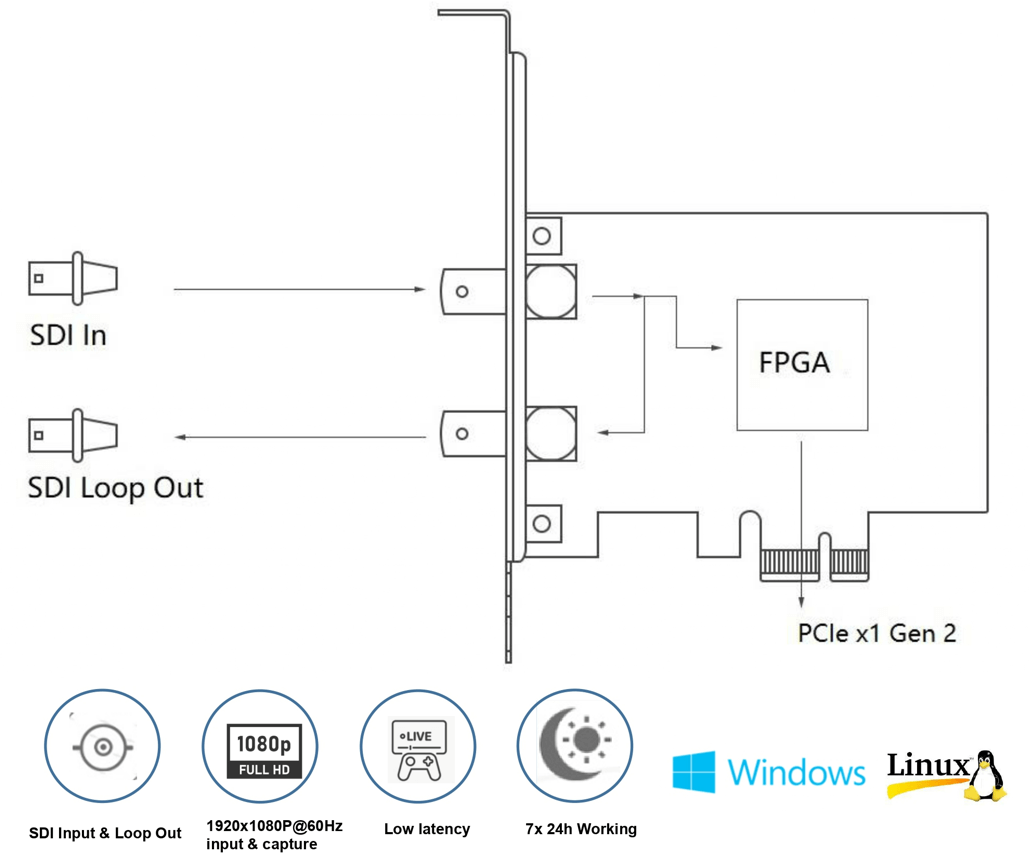 TBS6331R-SDI is a high-quality, PCIe x1 (Gen 2) raw data capture card. It features one 3G/HD/SD-SDI input that supports capturing uncompressed, real-time video at full HD resolutions of up to 1920x1080P@60Hz. Additionally, this card also includes an SDI loop-out, allowing for easy monitoring of the input signal.