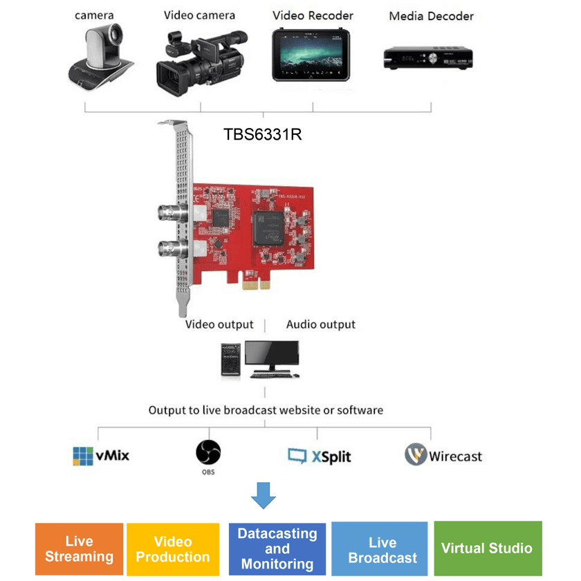 TBS6331R-SDI capture card is compatible with all major operating systems and software such as OBS, vMix, and Wirecast, enabling seamless integration for video recording, streaming, and live production scenarios.
