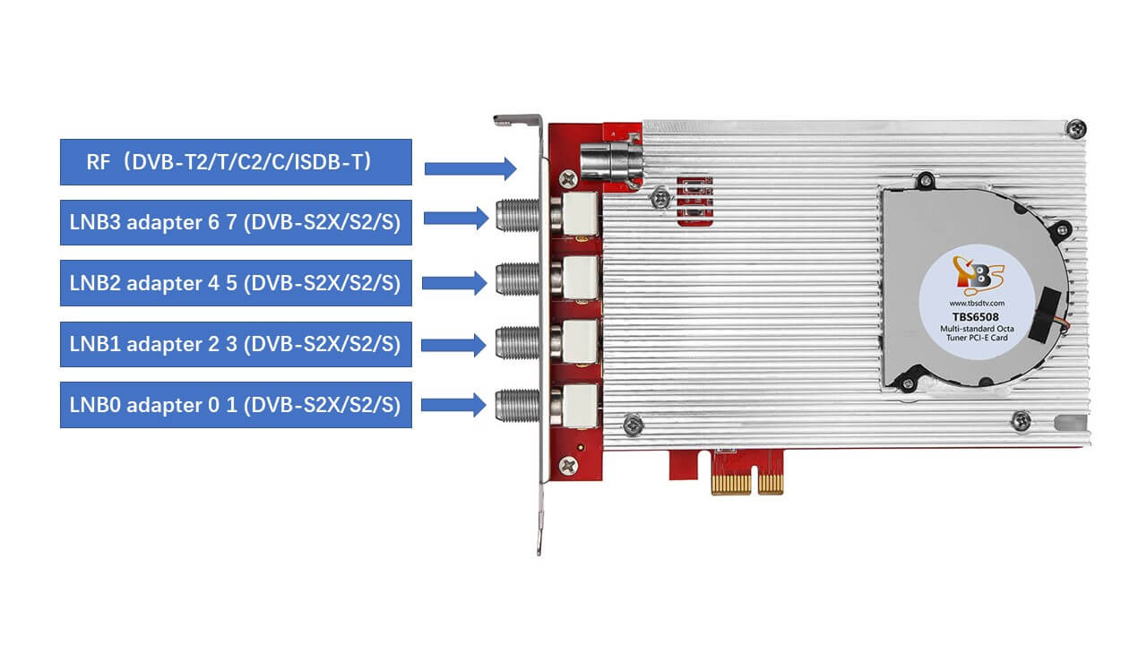 TBS6508 is a Octa PCI express TV tuner card that supports multiple digital TV standards including DVB-S2X/S2/S/T2/T/C2/C/ISDB-T, four RF IN is independent with each other. With this multi-standard TV tuner card, it is much easier to switch between different digital TV signals.
