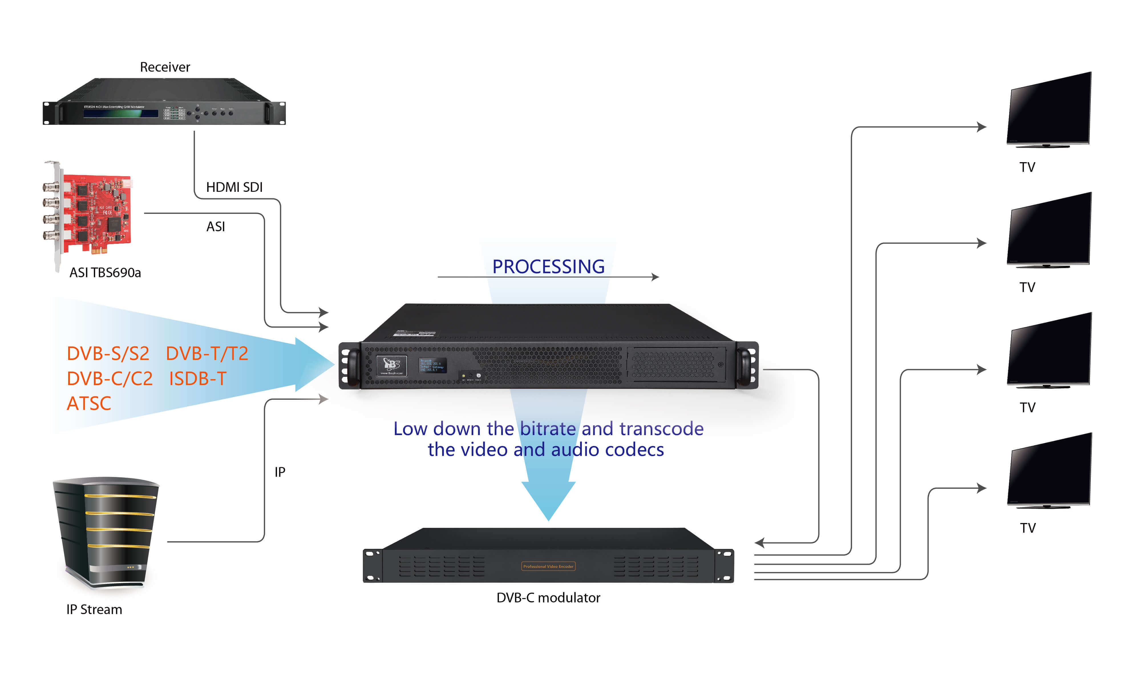 TBS8510 Pro Multiple inputs H.264/H.265 IPTV HD Video Transcoder/ Multi purpose headend
