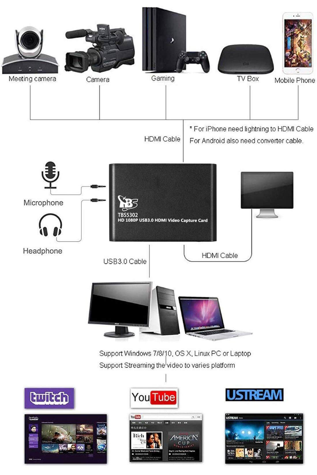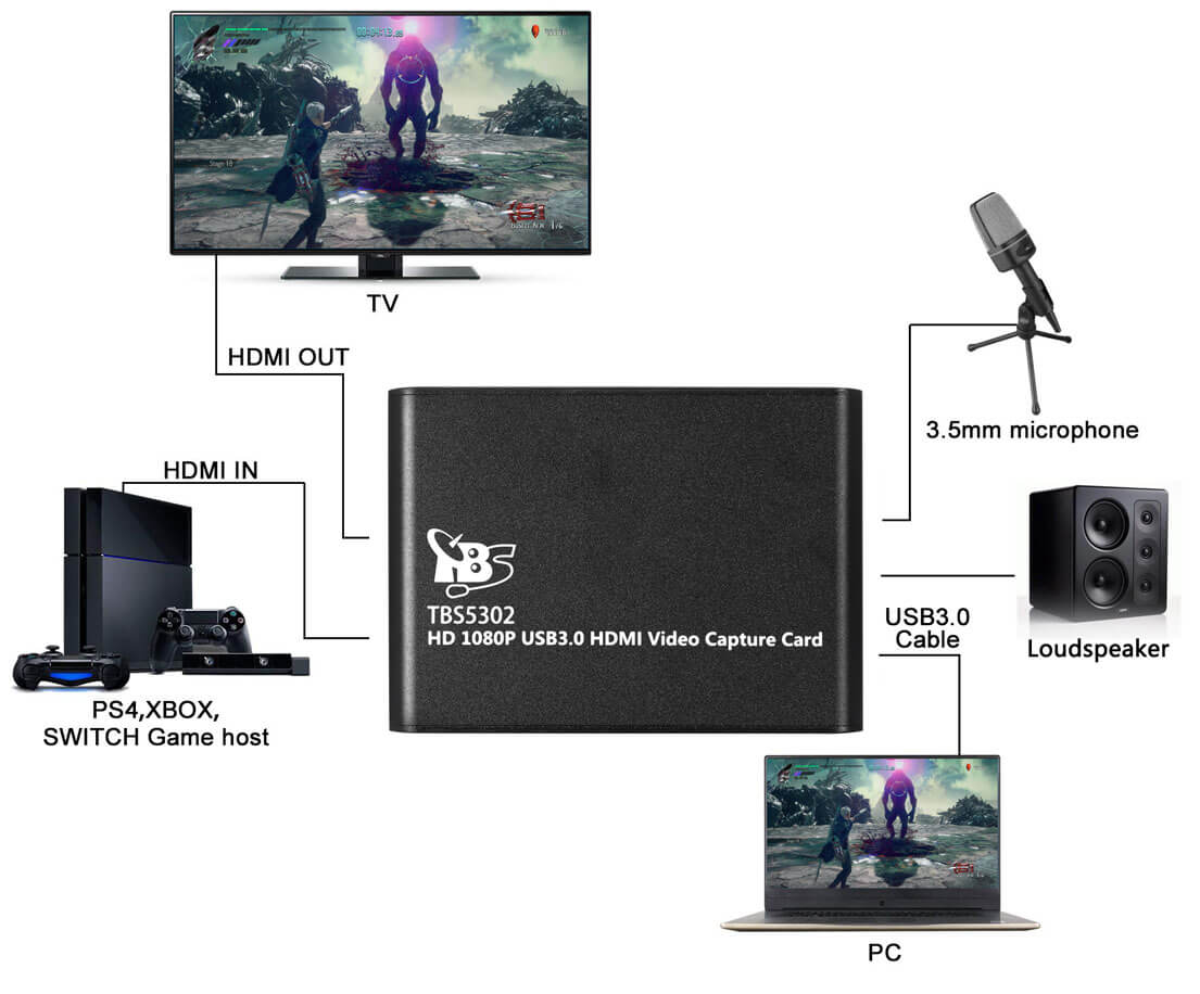TBS5302 1080p USB3.0 HDMI HD Video capture card with HDMI 1.4 port is a device which has a strong performance, superior compatibility, simple installation and many other features. It completely supports full HD Video and Audio capture and playback. It not only can capture one HD 1080P 60FPS input and output signal, but also offers a separate 3.5 mm audio input for accompanying audio or voice-overs, and a HDMI loop out port for connecting another HDMI device while you are making live stream.